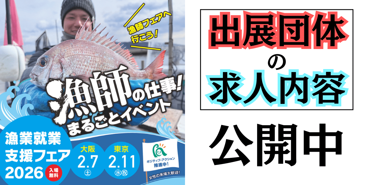 漁師.jpからのお知らせ 2026年2月4日 NEW! 【設立14年目】こんな大事な日を忘れてた!! 2026年1月23日 漁師フェア110回開催を前に、、、 2025年12月1日 🐟福井県立大学の学生たちと作った、漁師フェアPR動画!~漁師.jpの「スーパーヒーロー」と過ごした2日間~ 漁師.jpからのお知らせ一覧 地域の漁業関係者からのお知らせ 神奈川県ザ・ノンフィクションYouTubeに神奈川県平塚市漁協 日海丸の漁師さん登場 沖縄県「沖縄県漁業就業支援フェア2026」を開催! 出展団体紹介【漁業就業支援フェア2026】千葉県海洋人材確保・育成センター🌊 地域の漁業関係者からのお知らせ一覧 漁師.jpPRパートナー Xアカウント Tweets by ryoushi_PRP 漁師.jp公式SNS 漁師.jp 公式Youtubeチャンネル japantuna 公式Youtubeチャンネル
