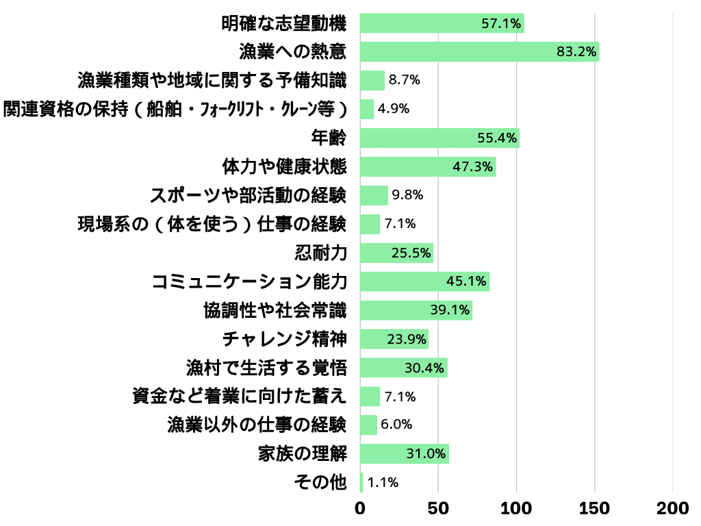 1番は経験でも資格でもない!出展者全体の8割以上が、「漁業への熱意」だと回答しています。