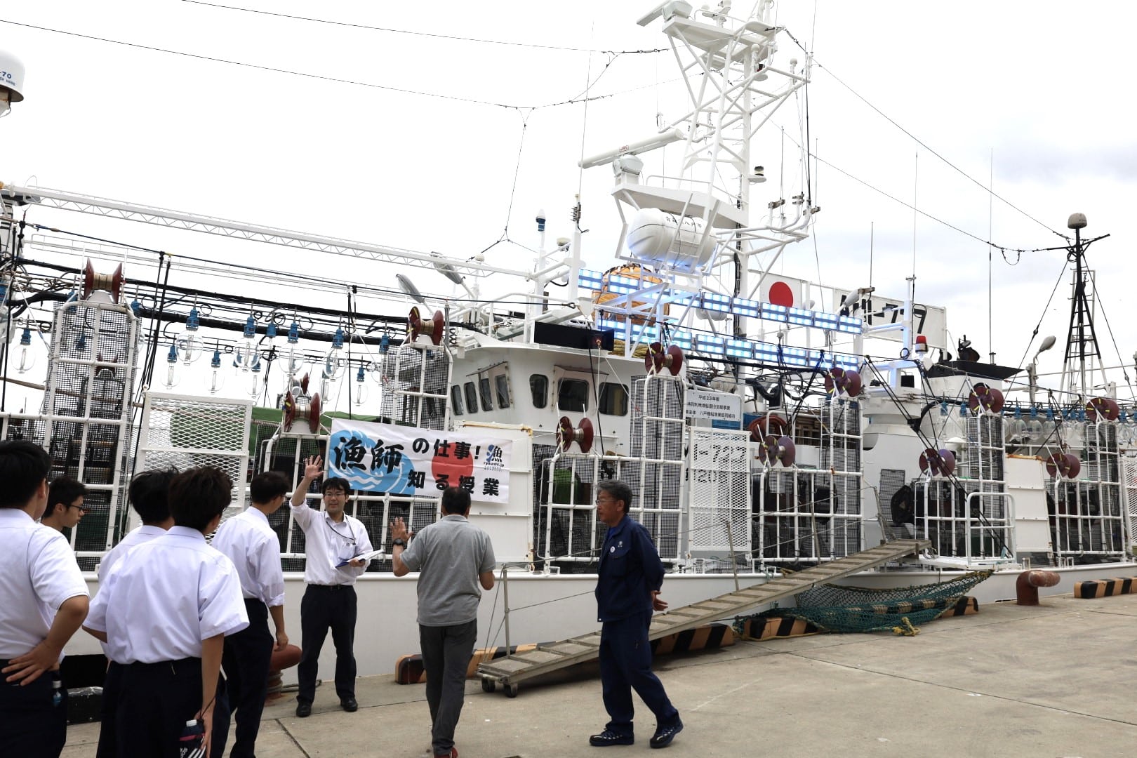 沖合・遠洋漁業遠洋イカ釣り漁巨大な加工船がペルー沖など世界の海を渡っていく。 漁法 夜間、集魚灯を照らし、そこに集まってきたイカを釣り上げる漁。以前は人手で釣る船もあったが、現在はほぼ自動化され、コンピューター制御の釣り機で次から次へと釣っていく。完全に自動化されたイカ釣り漁は、まさに世界の海を渡る動く加工工場だ。日本の港を出て、10日ほどかけて漁場に到着。ほとんどの場合夜間の操業なので、夕方4時ごろから操業準備し、7時ごろに操業開始。揚がってくるイカを選別し、ケースに詰め、急冷室へ送るという作業を明け方まで繰り返す。1日平均5,000ケースというから、その仕事量は相当なもの。だいたい1カ月前後続けると満杯になるため、近くの港でいったん運搬船に積み替え、再び漁場へ戻る。航海は長くて5カ月ほどに及ぶこともある。 漁場 ニュージーランド沖、アルゼンチン沖、ペルー沖、北太平洋 魚種 ニュージーランドスルメイカ、マツイカ、アメリカオオアカイカ、スルメイカ 2025年7月「船と漁業を知る授業in八戸」より 漁業のこと、漁師さんのこと、もっと学ぼう!